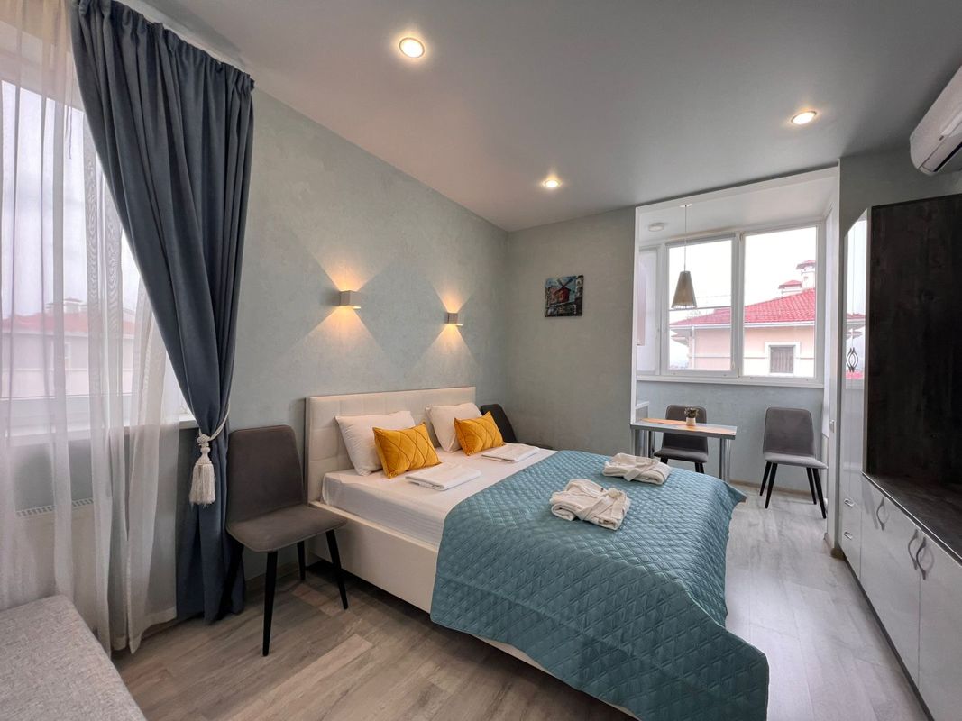 Вид из окон во двор, на детскую площадку и на парковую зону. Планировка в виде студии. Спальные места: двуспальная кровать и диван-кровать. 4 спальных места.