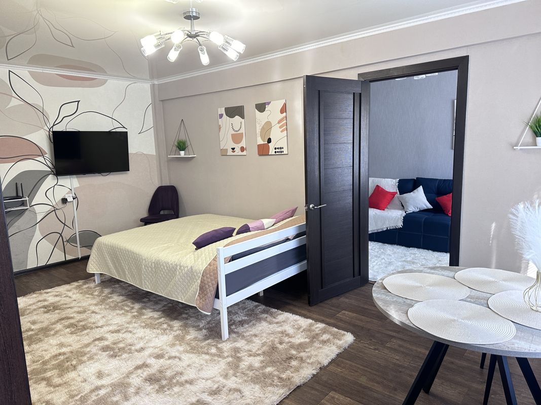 В квартире есть вся необходимая мебель и техника. Двуспальная кровать 160*200, диван, который раскладывается в спальное место 140*200. На кухне имеется холодильник, газовая панель, микроволновая печь, чайник, посуда для приготовления еды.