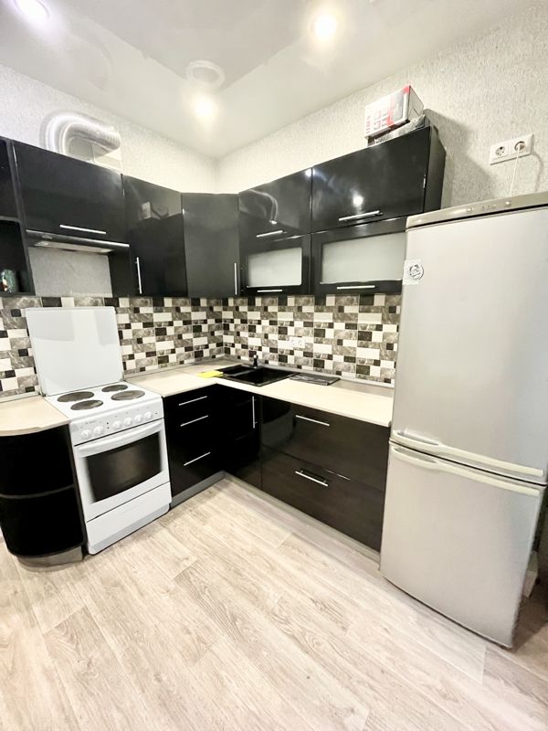 * полностью оборудованную кухню (газовая плита, микроволновка, холодильник, электрочайник, набор посуды);