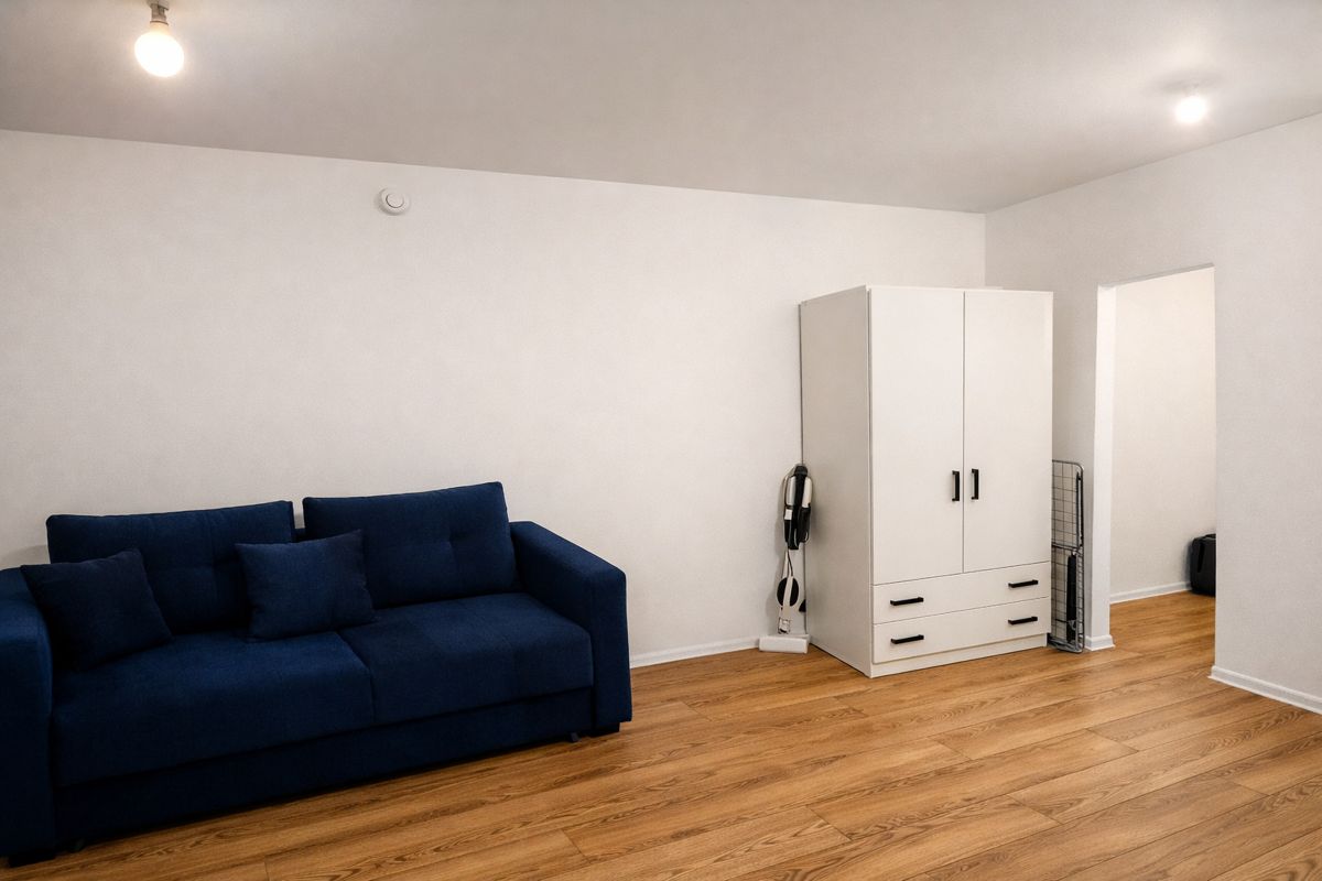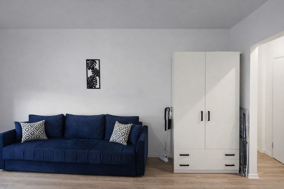 Уютная жилая зона с удобным диваном, компактная кухня, обеденная зона и современная ванная комната. Всё продумано для комфортного проживания 1–2 гостей.